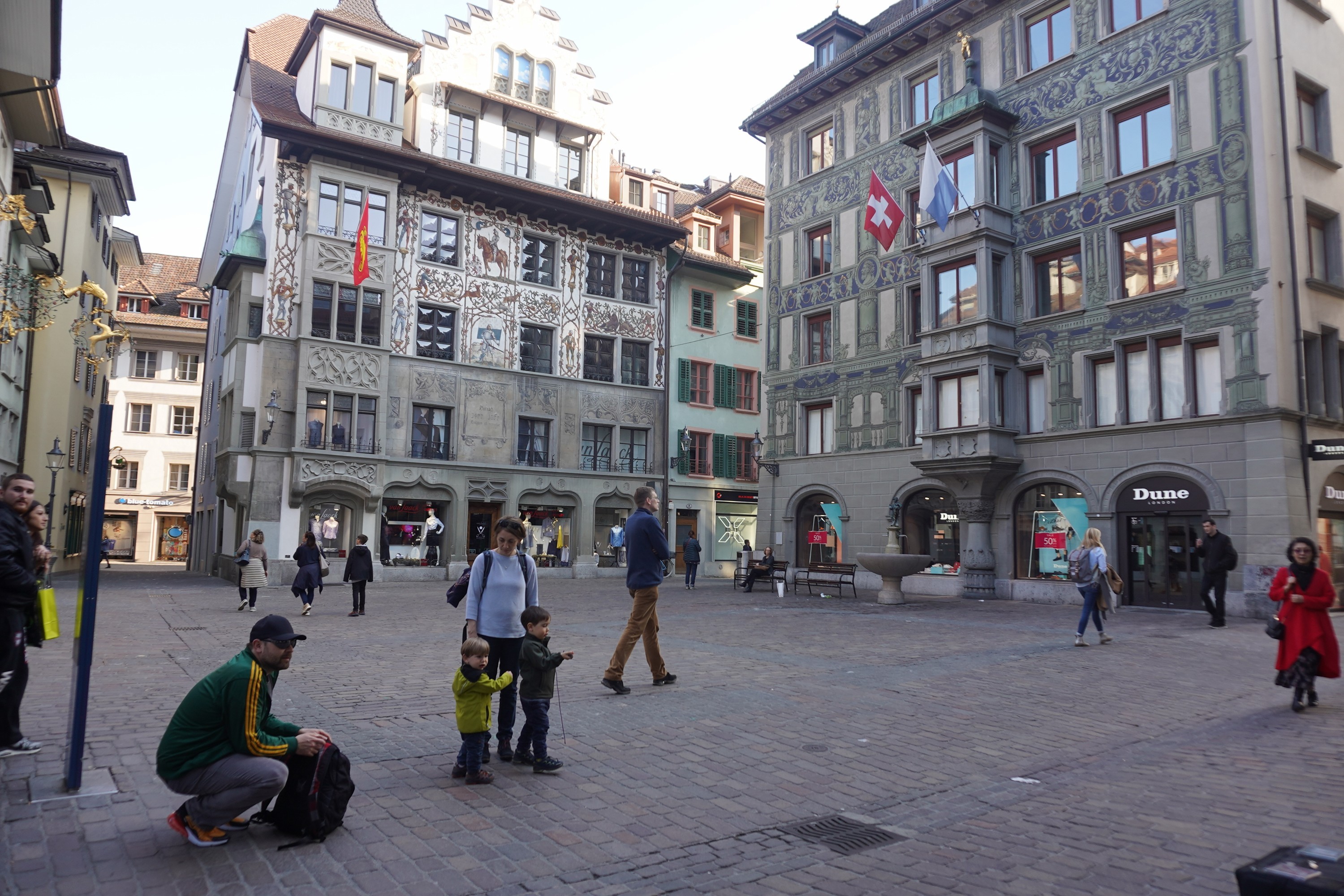 Vieille ville animée même si les magasins ont fermé à 16h (samedi). Hirschenplatz.